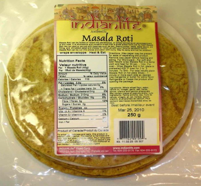A spiced up roti made with 100% whole-wheat flour Whole wheat flour, water, canola oil, vinegar, salt, garlic, herbs, spices, cilantro and calcium propionate.