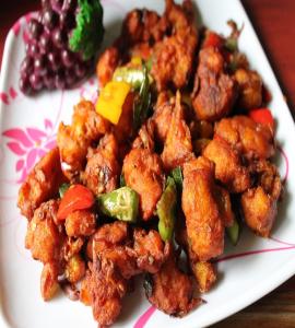 Boneless cubes of bone in chicken fried and tossed in a special aromatic sauce made with chillies.