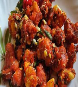 Shrimp marinated in corn flour batter spices, deep fried & tossed with spices and chilly sauce.