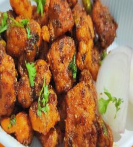 Cauliflower pieces marinated in corn flour batter spices, deep fried and tossed with yogurt & spices